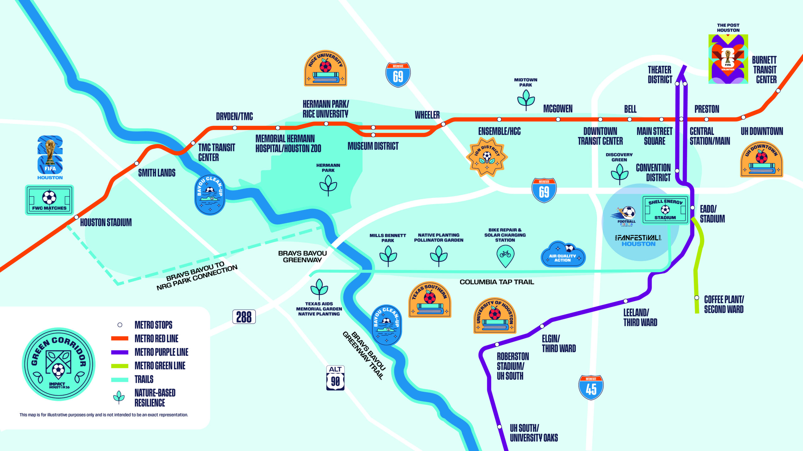 HOUSTON, TEXAS (March 17, 2026) – The FIFA World Cup 2026™ Houston Host Committee is proud to advance the Green Corridor, an initiative to highlight resilience and sustainable transit across the 14-mile loop connecting FIFA World Cup 2026™ venues. The Green Corridor concept, which originated in 2024 with the Sustainability Subcommittee led by Elizabeth Carlson, unifies under one name the connected network of public transit routes, hike-and-bike trails and public spaces that link key areas in Houston and FIFA World Cup 2026™ venues: FIFA Fan Festival™ in East Downtown and Houston Stadium. The corridor includes METRORail lines and the Columbia Tap Trail along with destinations across East Downtown, Downtown, Midtown, the Museum District and Third Ward. It provides an example of how Houston’s transportation and infrastructure can support large-scale global events sustainably while still serving everyday community needs. Moreover, it results in a seamless, accessible experience for out-of-town visitors and local residents alike, while showing how Houston always comes together for the greater good.